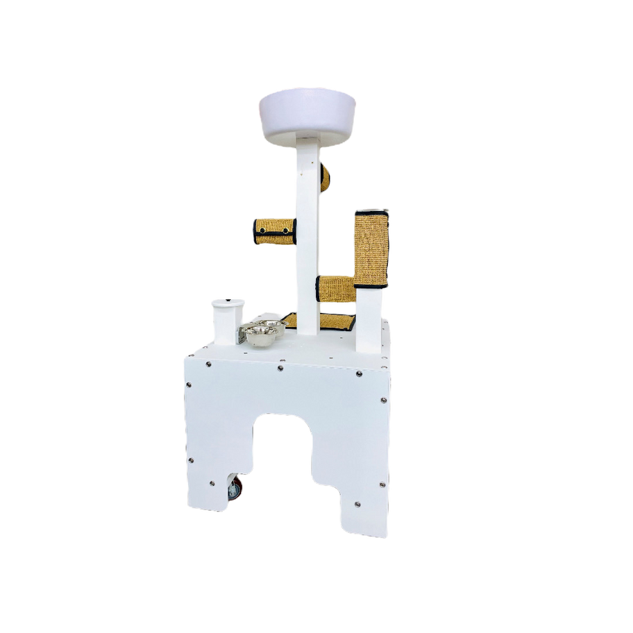 Our Catio Console is the perfect multi-purpose unit for your catio! Made of HDPE and ABS plastics, with stainless steel hardware and casters to withstand all weather. Won’t yellow in the sun! This unit provides a place to rest, multiple areas to scratch, food/water bowls, and a hidden compartment to store the litter box within!