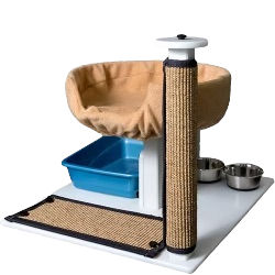 Studio Living Cage Insert (SL). Designed for the large cages now available. It features a divider to separate the litter box and food station, offers vertical and horizontal sisal pads for scratching, and an elevated bed. The bed’s 4″ curved walls provide a sense of privacy and spine support for the cat. Limited assembly required.